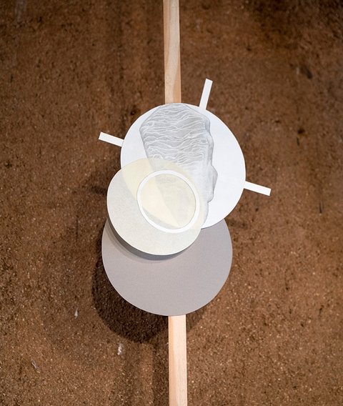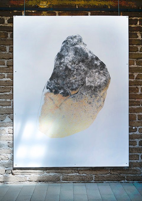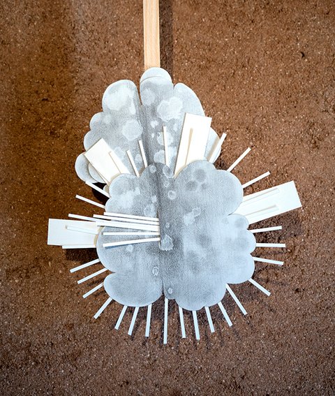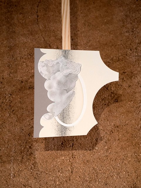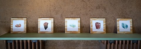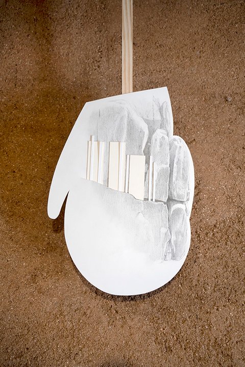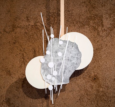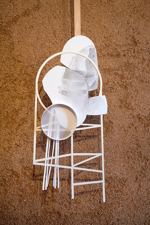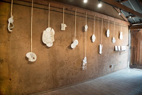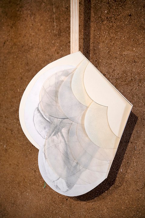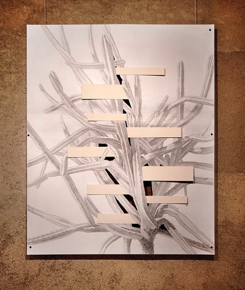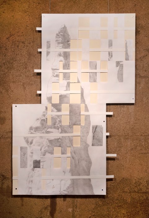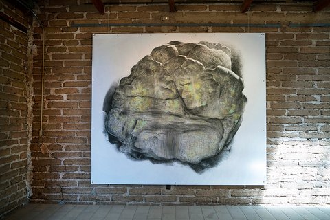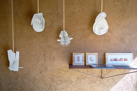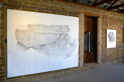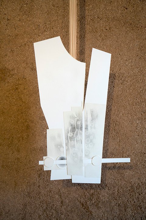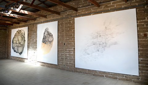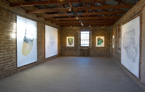 All the pieces are on paper, mostly executed with graphite or charcoal and pastel, (though a few include gouache and acrylic paint). The largest works in the main gallery were hung with magnets on steel frames suspended from the rafters. The smaller collage pieces were suspended on thin wood strips hung from the roof of the smaller adobe garage space.